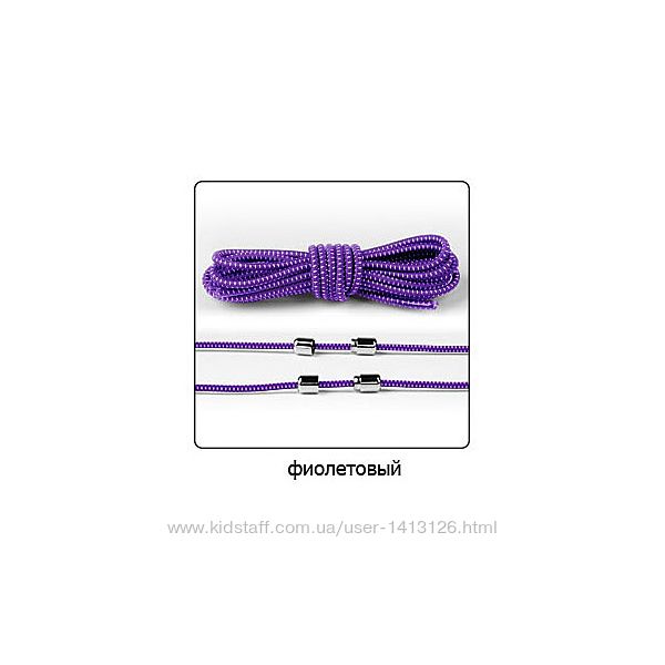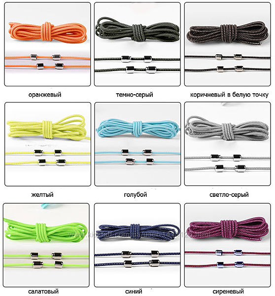 В комплект входят 2 эластичных шнурка по 100 см, диаметром 3 мм, 2 серебряных зажима, на одну пару обуви.Цвета: коричневый,черный в белую точку, черный, белый, серый, красный, фиолетовый, салатовый, синий, зеленый, розовый, бирюзовый, желтый, оранжевый, темно-коричневый в белую точку, темно-синий, голубой