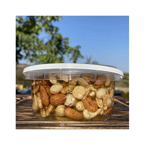 Суміш горіхів складається з таких горіхів: волоські, мигдаль, кешью, фундук, бразильській горіх, арахіс. Горіхи взяті у рівних пропорціях.