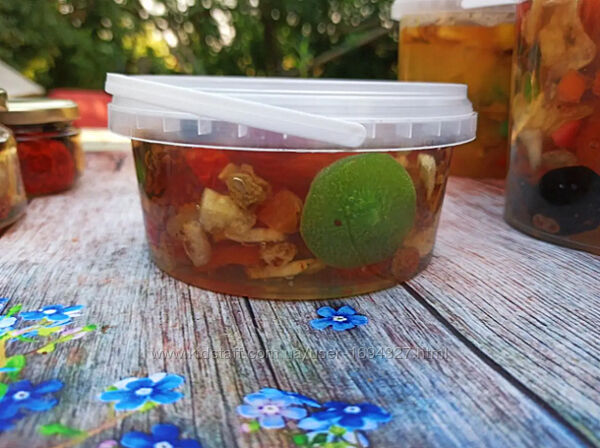 Мед з сумішшю сухофруктів 0.5 л 275 грн Пластикове відерце 0.5 л вміст: 250 грам суміші сухофруктів, 350 грам мед акація. Суміш сухофруктів складається з: банан чіпси, курага, ізюм, кизил (чері), фінік без кісточки, цукати подрібнені, ківі цукати кільця, чорнослив, інжир сушений.