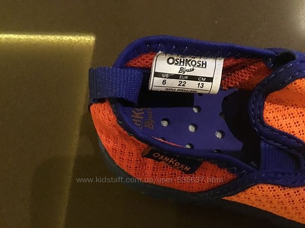 Продам аквашузы Oshkosh 22р. Покупала своему сыну на офсайте, но в связи с Короной так и не попали на море летом, а следующим летом они уже малы будут. Не носились, только мерились в квартире, но бирки сразу срезала, т.к. покупала заранее весной. Подойдут как мальчику так и девочке за счет своей расцветки, очень лёгкие, реальная длина стельки 13,5см.100% предоплата, возврат не предусмотрен. Отправлю НП или Justin за счёт покупателя.