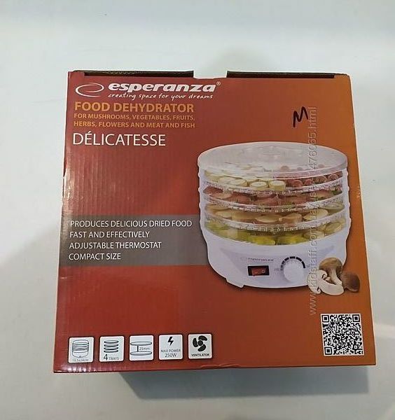 Привезенная из Европы сушка для фруктов Esperanza EKD003. Мощность потребления (макс.) - 250 Вт, количество лотков для фруктов - 4, регулировка температуры (8 режимов) от 35 до 70 градусов, встроенный вентилятор для циркуляции теплого воздуха, защита от перегрева, компактные габариты, диаметр лотков - 24 см, высока сушки - 19,5 см, страна производства - Польша (КНР). Хорошее качество. Предоставляется настоящая документированная гарантия - 6 месяцев.Оплата - наложенный платеж либо предоплата на карту. Способы доставки: самовывоз, Новая Почта, Укрпочта, Деливери, Justin (отправка 2 раза в неделю). Возврат товара – в течении 14 дней при сохранении упаковки и отсутствии следов его использования.