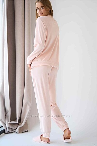 Комфортну посадку штанів на будь-якій фігурі забезпечує широкий пояс із тасьмою для фіксації на талії. Дві вшивні кишені з боків, внизу штани на еластичних манжетах, які не тиснуть. Велюровий костюм універсальний: підходить для відпочинку, приймання гостей, робочої відеоконференції та інших неформальних випадків, коли важливі комфорт і естетика.