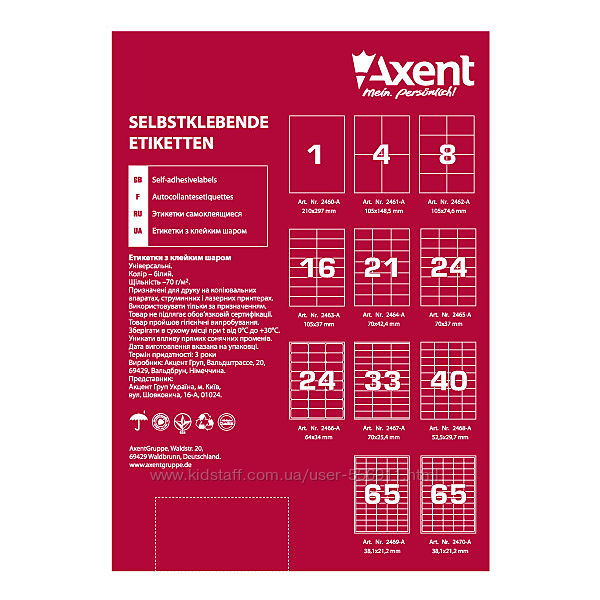 Этикетки самоклеящиеся, универсальные Axent для лазерных и струйных принтеров, а также копировальных аппаратов. Применяются для адресации писем и посылок, штрих-кодирования товаров, классификации документов. Форматы, совместимые с наиболее известными компьютерными программами. Автоматическая подача бумаги в принтерах. Индивидуальная упаковка — картонная коробка с крышкой для удобного извлечения листов.Артикул (2475-А)