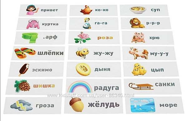🔸У наборі: основа-планшет, 74 плашки з літерами, по кілька штук кожної літери, 2 плашки-знаки та 42 шт 2х сторонніх карток - це 84 ілюстрації різної тематики: звуки тварин, пори року, спорт, продукти, частини тіла, рослини, погода і т.д.⛹️♀️🌧️👂🌳🛒