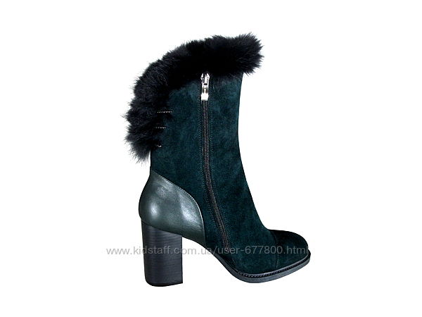 Сапоги(полусапожки) зимние из натуральной замши и кожи в зеленом цвете, оригинальная задняя шнуровка дает возможность увеличить объем до 5 см. Декорированы напуском из черного натурального меха.Обустроены широким устойчивым каблуком. Очень удобная колодка. Качество на высоте. Сапоги очень красивые и теплые