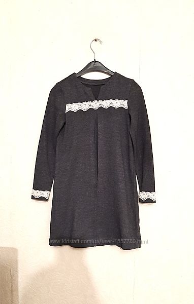 Подробное описание: Тёплое платье серое трикотажное длинный рукав с белым кружевом на девочку
