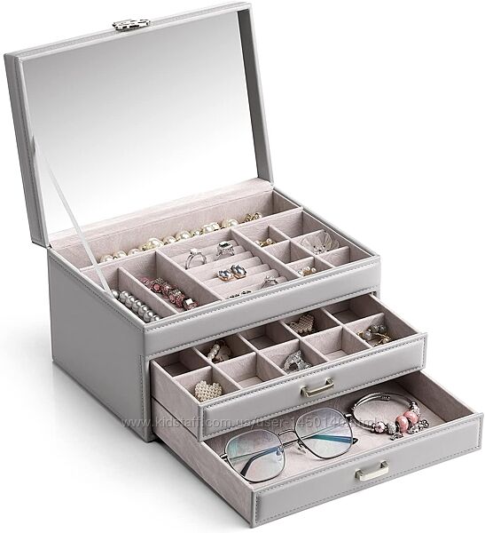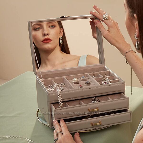 Шкатулка для украшений идеально подойдет в качестве подарочной и функциональной вещи, которая поможет женщинам организовать свои ювелирные украшения. Эта шкатулка имеет множество отделений для различных типов украшений. Вместительный кейс для украшений может быть использован для поездок или для хранения украшений в домашних условиях. Стильный дизайн и качественный материал делают эту шкатулку привлекательной для каждого ювелирного коллекционера. Сундучок для украшений имеет компактный размер и отличается прочностью и надежностью. Шкатулка для украшений имеет встроенное зеркало. Вы можете сразу примерить аксессуары к наряду и выбрать подходящее по настроению. Шкатулка для ювелирных изделий имеет лаконичный дизайн, который будет гармонично смотреться в любой интерьере. А также позволит сэкономить место на полке за счет компактных размеров. Футляр для украшений выполнен из экокожи, которая не требует особого ухода и легко моется. Размеры: 25.6 x 18.6 x 15.2 смДругие объявления продавца