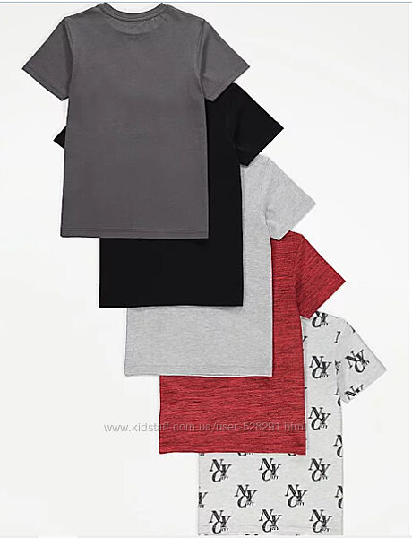 Футболки George на 5 - 6 лет, рост 110 - 116см.Состав: черная и темно серая -100%хлопок, светло серая - 95%хлопок 5%вмскоза, красная меланжевая - 93%хлопок 7%вискоза, белая с принтом - 99%хлопок 1%вискоза.