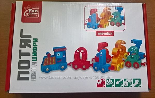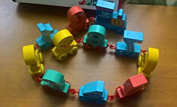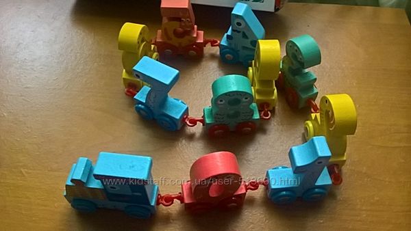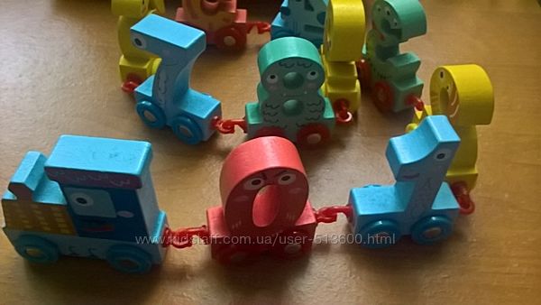 Поезд с цифрами предназначен для изучения счета, каждый вагон выполнен в форме цифр - от 0 до 9. Вагончики на колесах крепятся между собой крючками, что делает игру творческой.