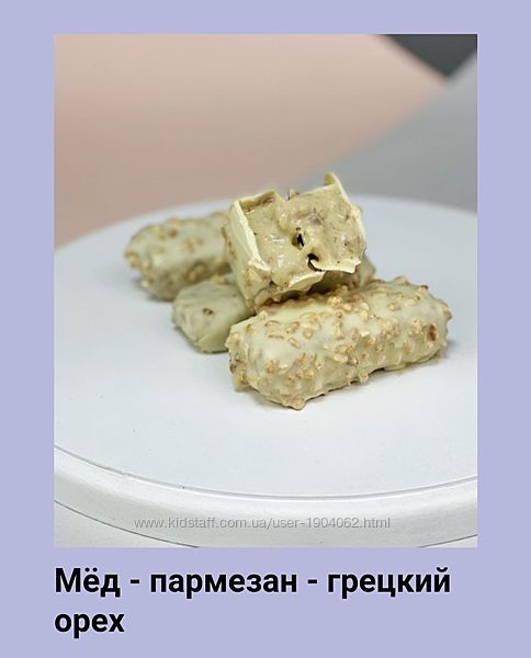 Грецкий орех в начинке, хрустящие шарики и медовый ганаш с добавлением сыра Пармезан.