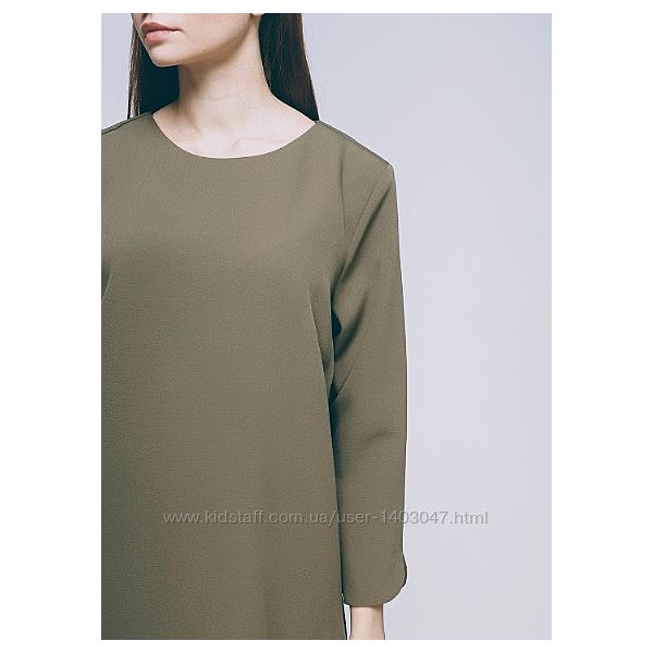 Практичное и удобное платье для повседневной носки, прямой слегка розширенный к низу крой, круглый вырез горловины, небольшой вырез на спине застёгивается на пуговичку, рукава 7/8 , полукруглый подол. Плотная ткань из полиэстера с эластаном. Цвет оливковый хаки.Материал 95% полиэстер, 5% эластан.