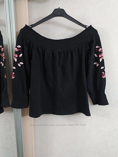 Будь в тренде! Блузы с открытыми плечами не сдают позиций и в сезоне весна-лето 2021, как нельзя лучше подчёркивая красоту и женственность.Великолепная блуза от Sinsay, 100% хлопок. Плечи приспущены, по верху и на манжетах резинки. Фасон свободный. Рукава декорированы принтом в виде аппликации (не вышивка).
