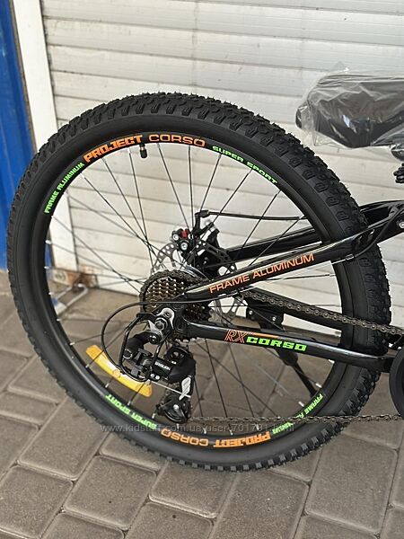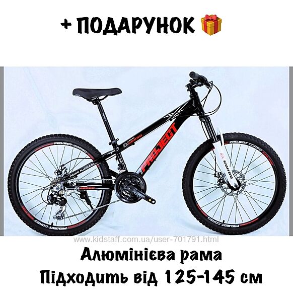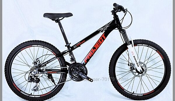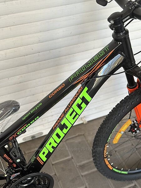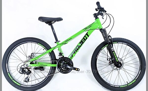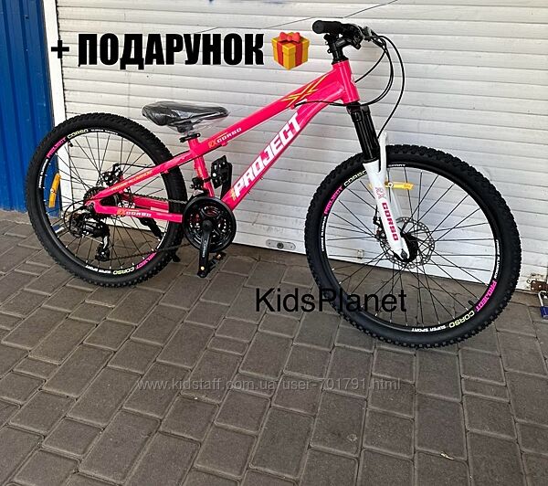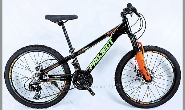 Гірський підлітковий велосипед з діаметром коліс 24 Corso Project - Велосипед виконаний у стильному спортивному стилі з яскравим розфарбуванням. Міцна алюмінієва рама здатна витримувати досить вагомі навантаження, а можливість регульованого підйому керма і сидіння дозволять рости велосипеду разом з дитиною. Підвищеному комфорту під час використання сприяє м´яке сідло та зручне кермо.Модель обладнана переднім та заднім дисковими гальмами, має амортизаційну вилку та 21-у швидкість.Таким чином в комплекті йде підніжка, яка дозволить стояти велосипеду без додаткової опори.