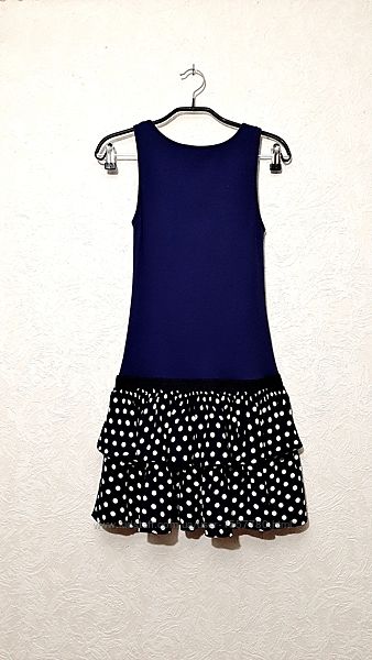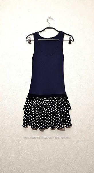 Платье девочке молодёжка, синий верх, чёрный низ с белым горошком, р40-44, бренд SABRA.Верх синий трикотаж хлопок + эластан, низ чёрный штапель в белые горошки, состав хлопок.В идеальном состоянии.
