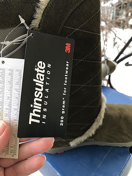 Всередині утеплювач Thinsulate, ще є хутро , яке іде повсьому сапогу. Модель тепла, племінниця такі носить 4 роки, як нові.Зверху замша, яка оброблена пропіткою.