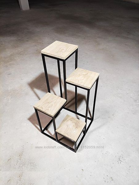 Подставка для цветов в стиле лофт собственного производства украсит домашний интерьер, общественное место, офис. 4-х уровневые полки 200х200мм высотой 800мм, 600мм, 400мм и 200мм из натурального дерева: дуб, ольха, сосна . Каркас изготовлен из прямоугольной профильной трубы 15х15мм, Н ожки (подпятники) - регулируются по высо те от 0 до 20 мм. Ц вет покраски черный, но может быть окрашена в любом другом цвете по желанию заказчика. Возможны другие конфигурации и размеры под заказ. Время изготовления до 7 дней. Предусмотрена бесплатная доставка по г.Киеву.Столы в стиле ЛОФТ: