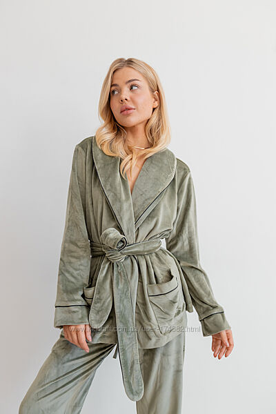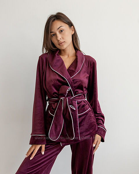 Піжама велюр на запахКласичні штани вільного крою з гумкою на талії та кишенями. Сорочка з поясом на запах, усередині на завязках.