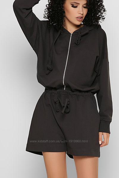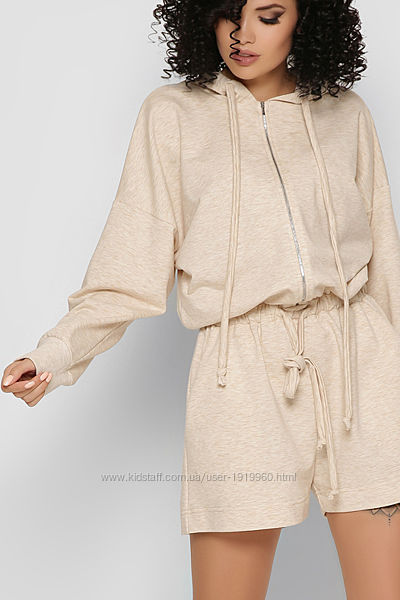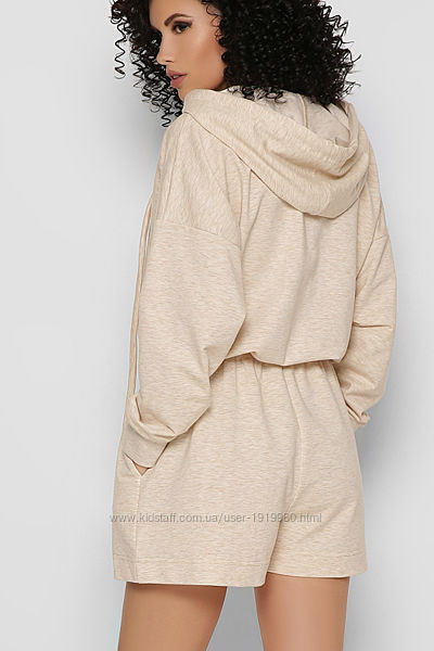 Дизайнерский комбинезон-шорты бежевого цвета. Модный фасон – oversize. Удобный капюшон на кулиске, длинные рукава с манжетой, прорезные карманы по бокам. На талии эластичная резинка со шнурком. Спереди застежка на молнию. В сочетании с кроссовками, модель отлично дополнит повседневный образ.Длина: 88 см