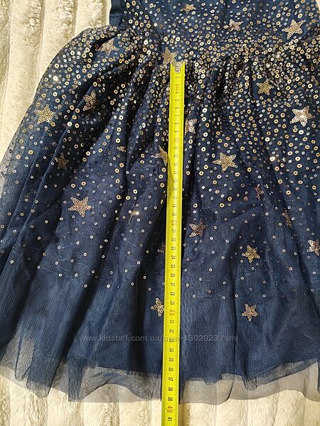 Ну ооочень красивое платье без рукавов из расшитого пайетками тюля со скрытыми кнопками сзади, присборенным швом на талии и расклешенной юбкой в три слоя.Размер 4-5 лет