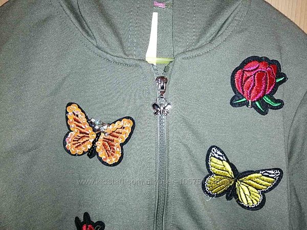 Продам ветровку известного польского бренда Mysia. Состав смешанный хлопок с добавлением полиэстера. Без подкладки. Есть капюшон. Спереди очень красивая отделка из аппликаций, украшенным пайетками и стразами. Спинка чуть удлиненная. Цвет зеленый хаки.Размер 134-140 на 9-10 лет.