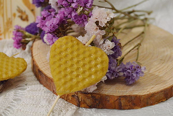 Медовые свечи сердечка для торта или сладостей из вощины.Размер 5см-4,5см-0,5мм,длинна с деревяной палочкой 9см.Сделаю в любом количестве.Натуральный продукт.