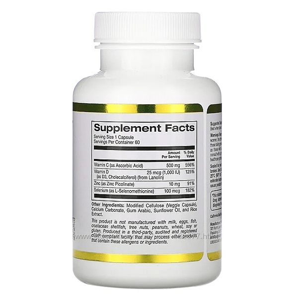 Витамин С (в виде аскорбиновой кислоты), витамин D (в виде D3, холекальциферола из ланолина), цинк (в виде пиколината цинка), селен (в виде L-селенометионина)