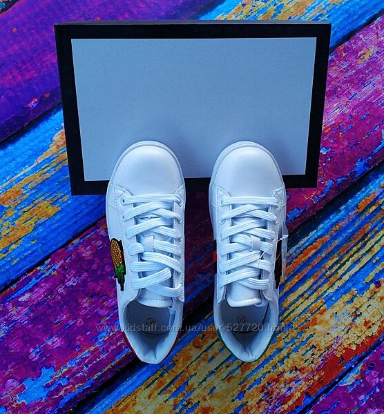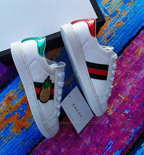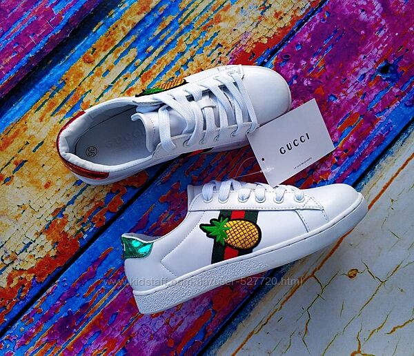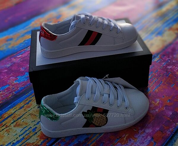 Женские кроссовки белого цвета в стиле Gucci Ace, РепликаКроссовки с декором в полоску зеленого и красного цвета , дополнены рисунком ананас
