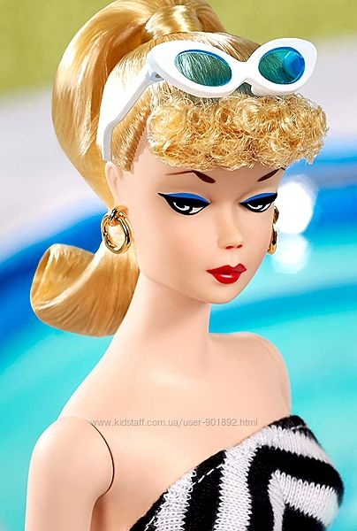 Коллекционная кукла Barbie Mattel приурочена к 75-летию бренда. Она воспроизводит классический вид Барби 1959 года в черно-белом винтажном купальнике без бретелек. На голове у нее фирменный гладкий хвост и короткая челка с кудрями.