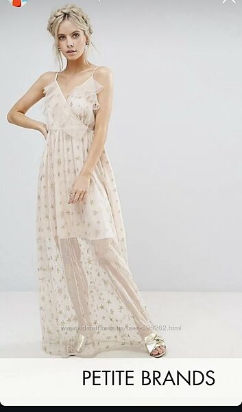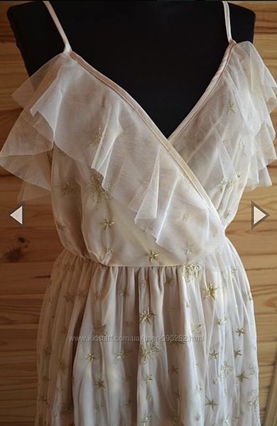 Нежное вечернее платье макси с воланами платье на выпускной ASOS premium True Decadance воздушное и легкое, с подкладом и вышивкой золотистыми нитками! Длина на 20 см короче, подрезано под рост 160м, одевалось единожды на 30 мин фотосессию! В идеале! Бретельки регулируются, размер М, подойдёт на С.