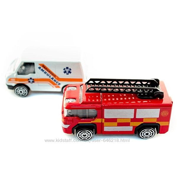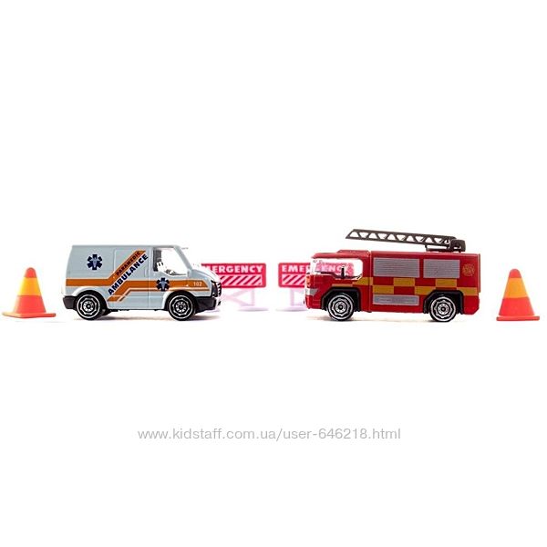 В набор входят две машинки, два дорожных конуса и два элемента заграждения. Одна из машинок – карета скорой помощи (реанимационный автомобиль), вторая – пожарная машина. Пластиковая лестница пожарной машины, расположенная на ее крыше, может подниматься почти под любым углом.