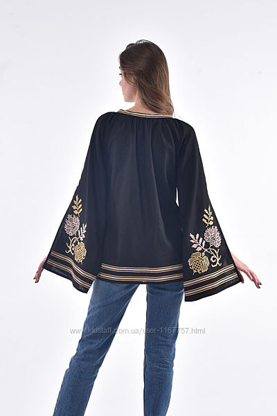 Вишукане та елегантне вбрання для розкішної жінки має бути прикрашене вишивкою. Не ми придумали цю аксіому – так повелося на українській землі та далеко за її межами з давніх давен. Достатньо подивитись на довершену вишивану блузу «Княжна», щоб упевнитися в цьому. Золотава вишивка на чорному полотні створює дивовижний контраст, що надає моделі оригінальності та святковості. Вона зображує улюблений орнамент українських майстринь – яскраві квіти та листочки. А по круглому коміру, манжетах та низу блузки вишивка стає лаконічною стрічкою. Світлі нитки здавна обирали для декорування урочистого одягу, та сьогодні таке рішення актуальне і для повсякденного виходу на ділову зустріч, побачення чи посиденьки з подружками.«Княжна» вражає незвичайним фасоном. Вона має вільний просторий крій, що гарно пасує до будь-якого типу фігури. Родзинка моделі – пишні рукава з розрізами до ліктів. Додайте до блузи casual-джинси або класичні брюки – і ефектний лук готовий