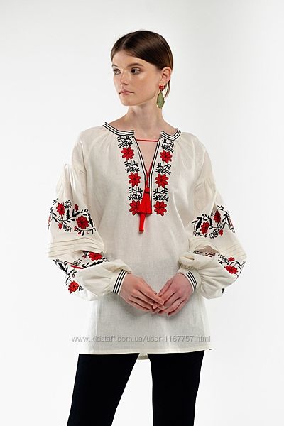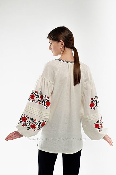 У вишивці закладено генетичний код українського народу. Так здавна вважали наші предки, так вважаємо і ми, створюючи автентичне вбрання для шанувальників традиційних вишиванок. Модель «Доля» є яскравим підтвердженням цього. Почнемо оглядати її з вишивки – малюнок та стиль ми запозичили у поліських майстринь, що полюбляли зображати яскраві червоні квіти на жіночому вбранні, зокрема на рукавах (тут це рукава реглан зі зборкою по низу та манжетом на резинці) та нагрудді. Втім, червоно-чорне виконання є класичним для української вишивки та власне червоний є символічним. Любов, краса, здоров’я, жіноче щастя – те, до чого прагнуть дівчата, незалежно від часу та віку.Блуза «Доля» має прямий силует та комір стійку. Пишні, наче повітряні, рукави додають у цей доволі строгий образ легкості та грайливості. А ви в будь-якому випадку відчуваєте легкість та комфорт, адже сорочка пошита з натурального льону молочного відтінку. Її довжина становить 65 см. Носити виріб можна з одягом класичного та сучасного стилю – і пряма чорна спідниця, й джинси будуть доречними.