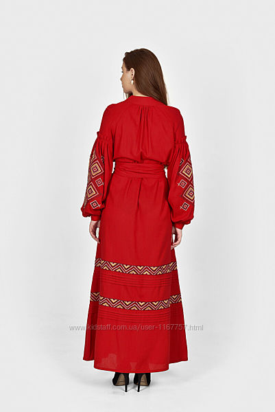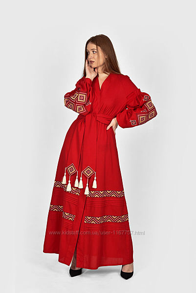 Розкішна сукня кольору світлого бордо з трьохбарвною вишивкою враз робить зі своєї власниці королівську особу. Скажете, що королеви не ходили у вишиванках? Ще й як ходили. Вишивка здавна вважалася філігранним оздобленням на будь-якому вбранні. У маленьких селищах й містечках вишиванням займалися майстрині вдома, а при дворі це було місією кращих з кращих у цьому мистецтві. Придивіться до вбрання королів та королев прискіпливіше – обов’язково побачите там вишивку. Можливо й таку, що зображена на сукні Сузір’я.Плаття з вишивкою, запозиченою з рушників та вбрання старовинни виконане з якісного льону. Ця сукня даруватиме вам комфорт та радість щоразу, коли ви надягатимете її. Довжина – 140 см, крій розпашний. Сукня зручно сідає на фігуру, акцентуючи увагу на принадах та приховуючи недоліки. Завдяки поясу ви можете підкреслити лінію талії, що вмить робить силует тендітним на звабливим. Пишні повітряні рукави зібрані вишиваними манжетами. З підборами чи на пласкій підошві – обирайте улюблене взуття та будьте певні – сьогодні ви найкраща.
