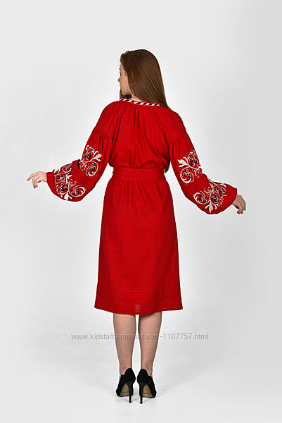 Та, що любить і вміє володарювати, достойна найкращого вбрання. Колір влади – бордо, який обирали принцеси та королеви, цариці й імператриці у різних куточках світу. Він личить й норовливим українкам. Бордова сукня Владарка з вишитим оздобленням, виконаним молочними та темно-бордовими нитками, гарно підкреслює гордовиту поставу та лідерський характер. Рясною вишивкою прикрашені пишні рукави, зібрані маленькими манжетами, що підкреслюють тендітність тонкого зап’ястя. Переливи рослинного орнаменту привертають погляди поціновувачів української вишивки та людей з бездоганним смаком.Слідом за неперевершеною вишивкою захоплення викликає дизайн сукні Владарка, що так доречно підтверджує назву моделі. Вона, наче повітряна, а ви у ній невагома, проте зібрана та зосереджена. Пояс формує силует, роблячи акцент на тонкій талії. Зона декольте закрита – тут лише елегантна вишита стрічка. Довжина плаття – 110 см. Воно прикрасить ваш звичайний день та покращить настрій у свято – достатньо поєднати його з відповідним взуттям та прикрасами.