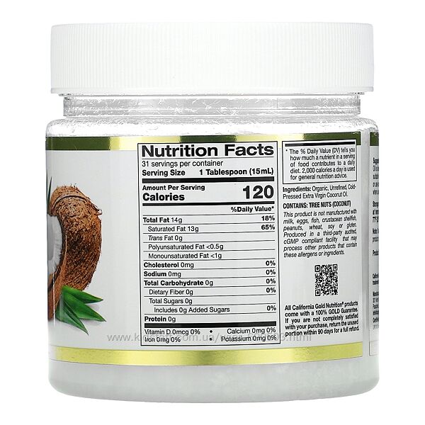 Описание: Органическое холоднопрессованное кокосовое масло экстра класса от California Gold Nutrition;