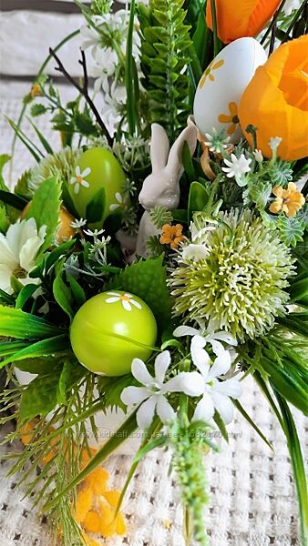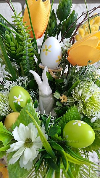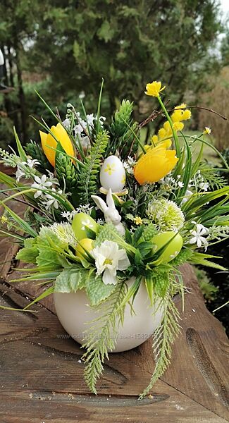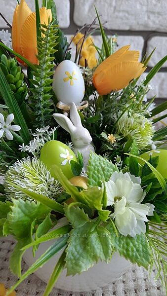 Пасхальная композиция в белом керамическом кашпо в виде яичной скорлупы с маленьким кроликом. Желтые цветы, белые ландыши и яркая зелень придают настоящее весеннее настроение. Оплата-100 % на карту или наложенный платёж (предоплата 100грн ). Доставка за счет получателя . Возврата нет.Другие объявления продавца