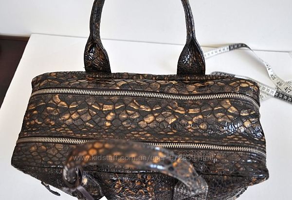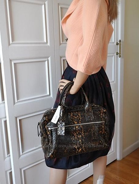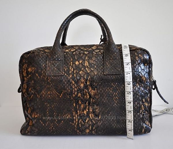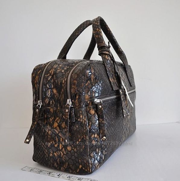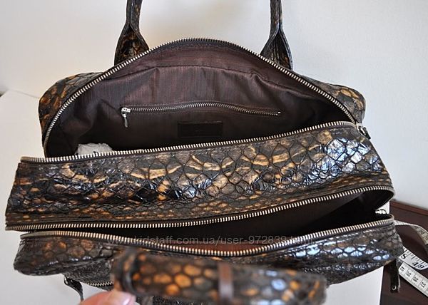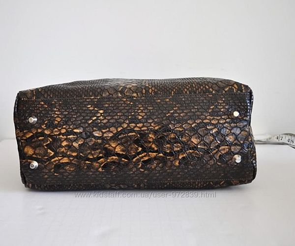 В продаже суперудобная благодаря конструкции сумка. 2 абсолютно обособленных отделения помогут удобно использовать ее внутренне пространство. Особенно важно для девушек, которые все свое носят с собой. Сумка супервместительная! В одном из отделений внутренний карманчик на молнии, На наружной стенке тоже есть карман на молнии. Отшита сумка из пресованной кожи, текстурированной под кожу питона, мягко лакирована. Сумка не жесткая, но не повисает абсолютно безвольно, не будучи наполненной под завязку. На мой взгляд сумку можно использовать даже в одно-,двухдневных путешествиях типа уикэндных. Абсолютно новая, с биркой, без пыльника Высота 26 см, ширина приблизительно 39 см, ширина дна 13 см, высота ручек 14 см-для ношения в руке
