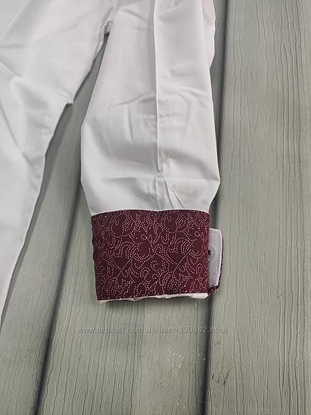 Стильная рубашка белого цвета с вишневым вставками на внутренней стороне воротника и манжетов, что придает стилю некую изюминку. Из качественного материала для мальчика. Модель с длинными рукавами.