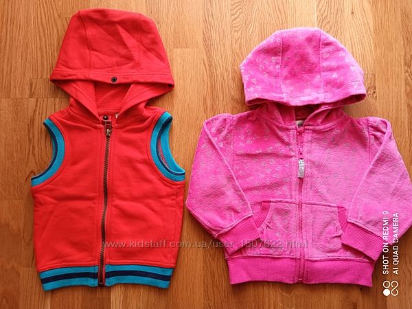 Кофта и жилетка на 12-18 месяцев, р. 74-80. В отличном состоянии, без нюансов Цена за 1.Малиновая в сердечки велюровая кофточка. Капюшон с атласной подкладкой.