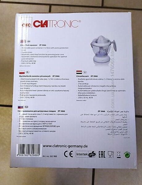 Привезенная из Германии новая соковижималка для цитрусовых Bomann CB1092/Clatronic ZP3066. Мощность потребления (макс.) - 40 Вт, емкость для сока на 1 л, оснащенная крышкой, автоматическое включение при нажимании на пресс-воронку, вращение вправо и влево для оптимального режима выжимания сока, отсек для шнура питания. Отличное немецкое качество. Страна производства - Германия (КНР). Предоставляется настоящая документироанная гарантия - 6 месяцев.Оплата - наложенный платеж либо предоплата на карту. Способы доставки: самовывоз, Новая Почта, Укрпочта, Деливери, Justin (отправка 2 раза в неделю). Возврат товара – в течении 14 дней при сохранении упаковки и отсутствии следов его использования.