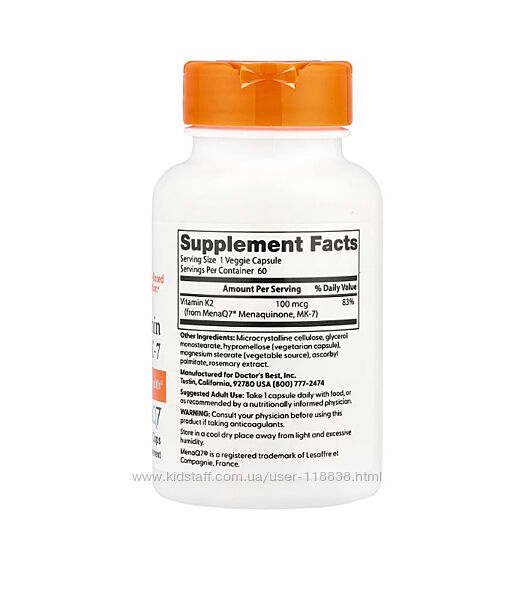# Doctor´s Best, натуральний вітамін K2 MK-7 з MenaQ7, 100 мкг, 60 вегетаріанських капсулОПИС: