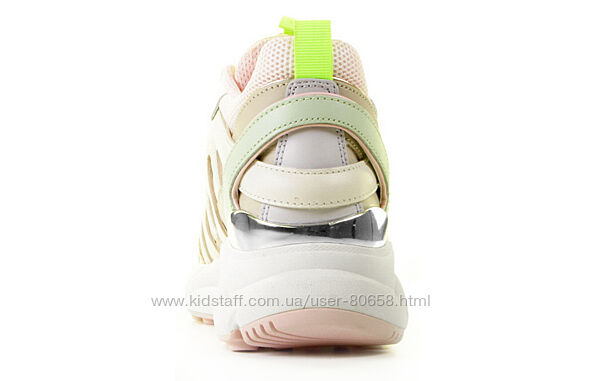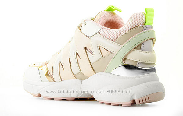 Эта модель имеет верх из сетки и кожи мягких пастельных тонов, таких как светло-розовый, кремовый и фисташковый, с отделкой белой кожей и металлическими кожаными вставками. Внутри - ткань. Шнурки кремового цвета и логотип по бокам, а также массивная кремовая / светло-розовая резиновая подошва высотой 3 см с заклепками завершают спортивный стиль. Цвет: разноцветный. (Крем / Мульти)