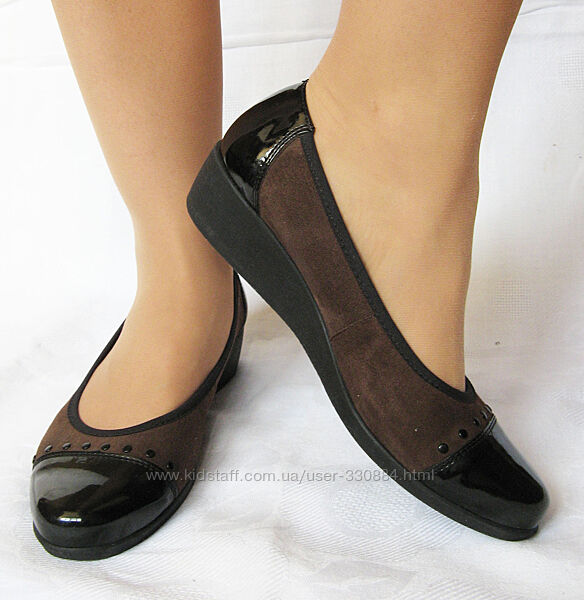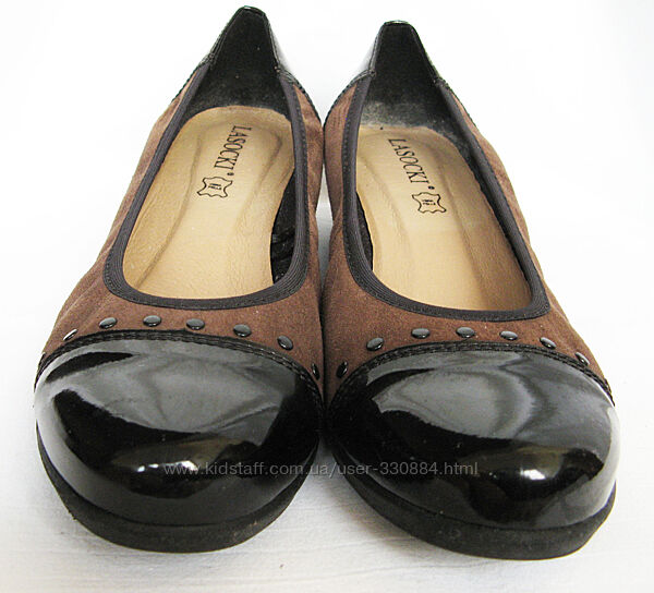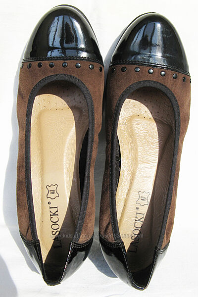 32. Комфортные и мягкие, как чешки, нарядные туфельки на маленькой танкетке от польского бренда качественной обуви "Lasocki" в отличном состоянии: чистенькие стельки, без посторонних запахов и недостатковМатериал верха комбинированный: натуральная замша коричневого цвета, очень мягкая и эластичная (там, где замша подкладки нет) и лаковая кожа