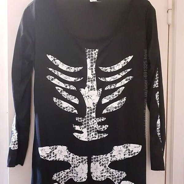 Пропоную чорну сукню з принтом Скелет від Smiffus. Матеріал поліестр, тягнеться. Малюнок у темряві не світиться. Уживане 1 раз акуратно, стан відмінний; дірок, плям чи затяжок немає, дивіться фото.Розмір вказаний L, довжина 150 см, ширина плечей 42 см, довжина рукава 62 см, ширина грудей під пахвами 54 см, ширина стегон 54 см, тягнеться до 62 см.