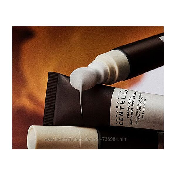 SKIN1004 - Madagascar Centella Probio-Cica Bakuchiol Eye Cream - крем під очі, формула якого збагачена антивіковими компонентами, такими як бакучиол та аденозин, які зменшують зморшки, розгладжуючи та надаючи шкірі еластичності. Також вони освітлюють темні кола під очима та вирівнюють текстуру шкіри, без набряків та припухлостей. До складу крему також входить запатентований комплекс Probio-Cica та цераміди, які мають живильні властивості, зміцнюють захисний бар´єр і прискорюють процес регенерації. Доповнює комплекс олія ши, яка захищає делікатну шкіру навколо очей від подразнення.