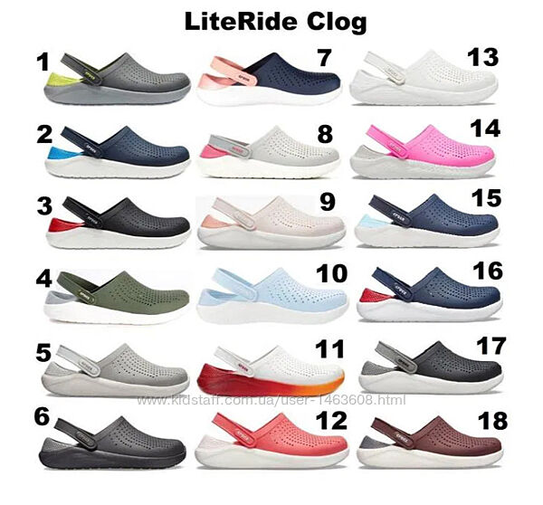 Поява Crocs LiteRide навіяно розвитком активного способу життя. Устілки взуття цієї колекції зроблені з революційного матеріалу LiteRide, який став наступним проривом в області комфорту світового класу. Завдяки еволюційному продукту взуття цієї лінійки стала на 40% м´якше і на 25% легше в порівнянні з аналогами з традиційного матеріалу Croslite. Виготовлені за новітніми технологіями, моделі колекції LiteRide забезпечують чудовий комфорт і підтримку стопи протягом цілого дня.В відміну від моделі Crocs Classic, в моделі LiteRide по верху сабо розташовано безліч дрібних отворів, завдяки яким ця взуття виглядає більш елегантно і її носити ще комфортніше , навіть в саму спекотну погоду. Цей фасон взуття добре захищає ногу від пилу і бруду.