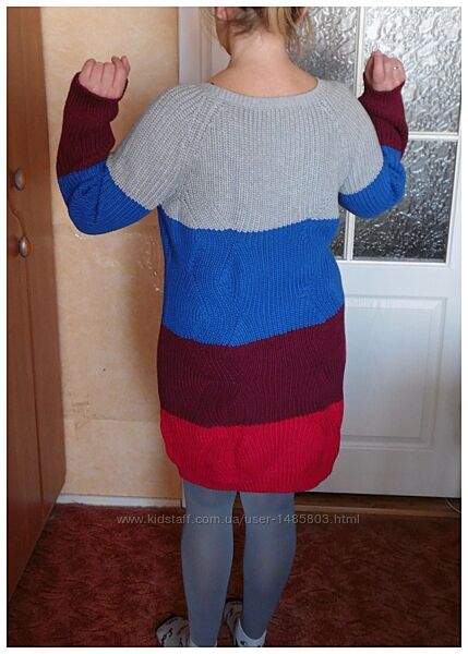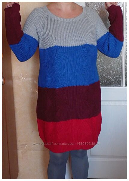 Платье отличного качества, красивая крупная вязка, приятное на ощупь, состав: 50% - хлопок, 50% - полиакрил, сделано в Бангладэш. Лично мне платье очень нравится, но не моя цветовая гамма, поэтому лежит не востребованным.Размер 40/42 евро - соответствует украинскому размеру 48/50, подойдёт и на р.52.
