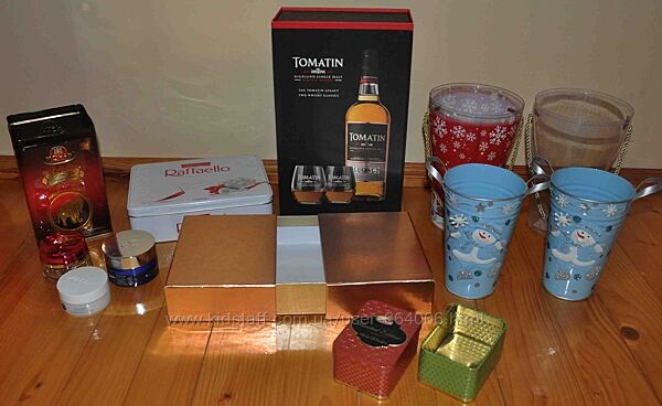 фото 5 - відерка-сніговики по 50 грн, відерка з золотим шнурком по 25 грн, дві прямокутні металеві маленькі коробочки - 30 грн за дві (одна без кришечки), золота розсувна картонна коробка - продана, біла металева прямокутна від рафаелло 35 грн, маленьківід кремів по 10 грн, картонна чорна від віскі 30 грн - продана
