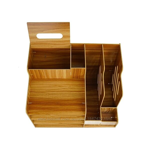 Органайзер для канцелярских принадлежностей и документов - практичный аксессуар, с помощью которого вы легко создадите идеальный порядок на рабочем столе. Позволяет удобно хранить папки с документами, книги или тетради, ручки, карандаши и прочую канцелярию в одном месте.Настольный органайзер имеет 2 отделения для хранения документов и папок, 4 полочки и 3 отделения для канцтоваров. Изготовлен из ламинированной фанеры под дерево.