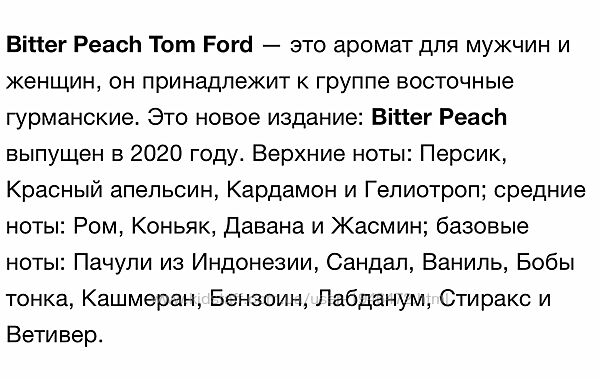 Парфум tom ford bitter peach🍑 оригинал 5 ml.Tom Ford Bitter Peach 🍑 — сладкий,чувственный,при этом богатый и характерный фруктово-цитрусовый унисекс-парфюм с ярко выраженными древесными и смолистыми оттенками новинка 2020 года.Дурманящий бархатисто-медовый аромат персика и цитрусовая свежесть красного сицилийского апельсина начинают ароматическую мелодию парфюма.Чувственное сердце Bitter Peach 🍑 раскрывается травянисто-пряным ароматом даваны с добавлением сладковато-алкогольных оттенков рома и коньяка.А волна теплой пряности пачули, пряно-древесного сандала, дымно-ароматического лабданума и сладковатой ванили,звучащих в финальном аккорде,уносит чувства к самым дальним уголкам внутренней чувственности.